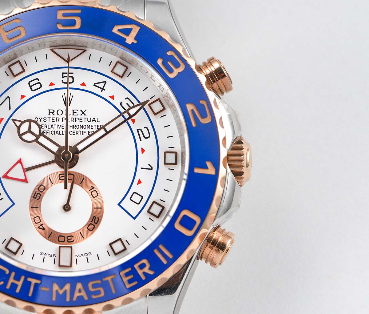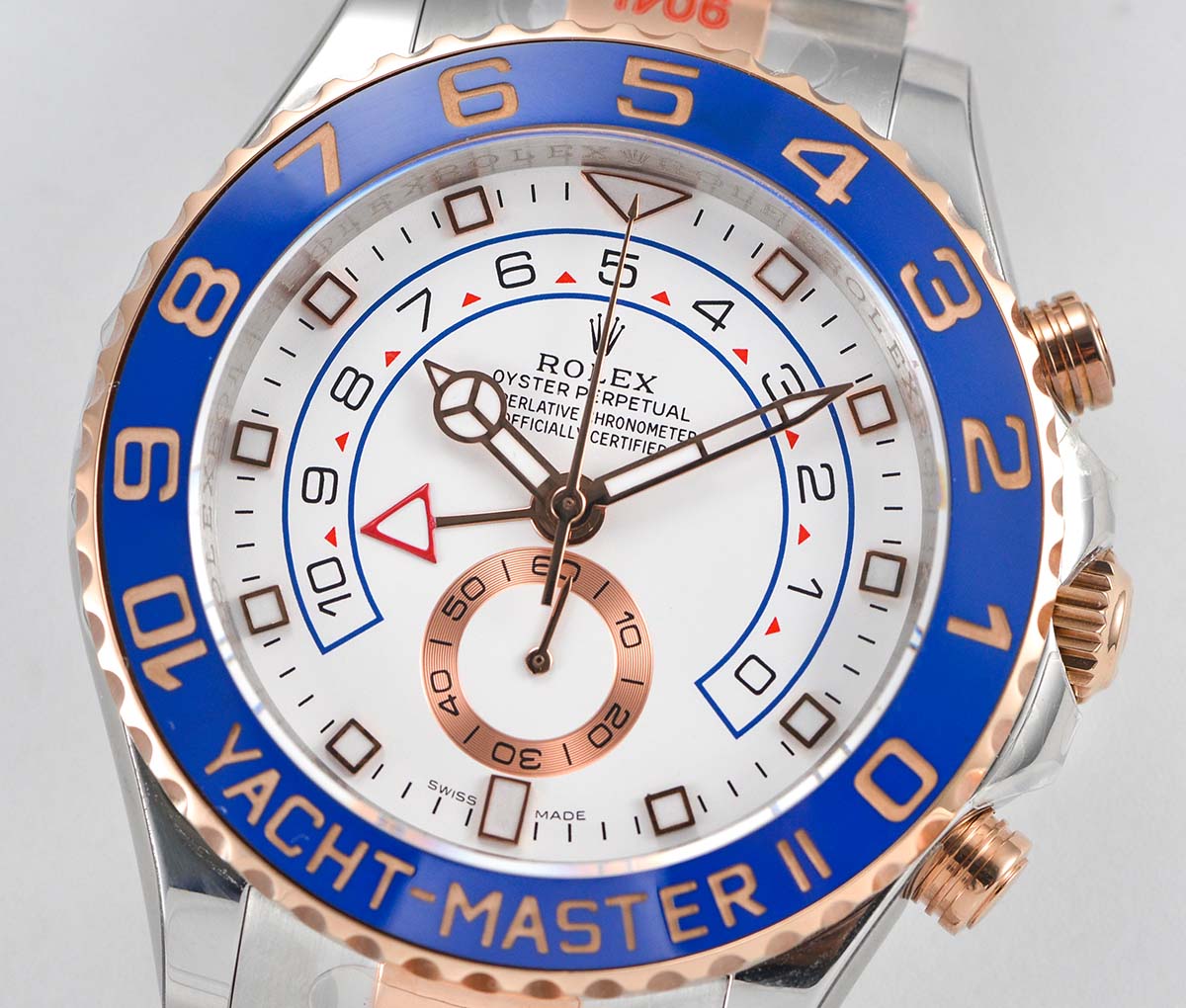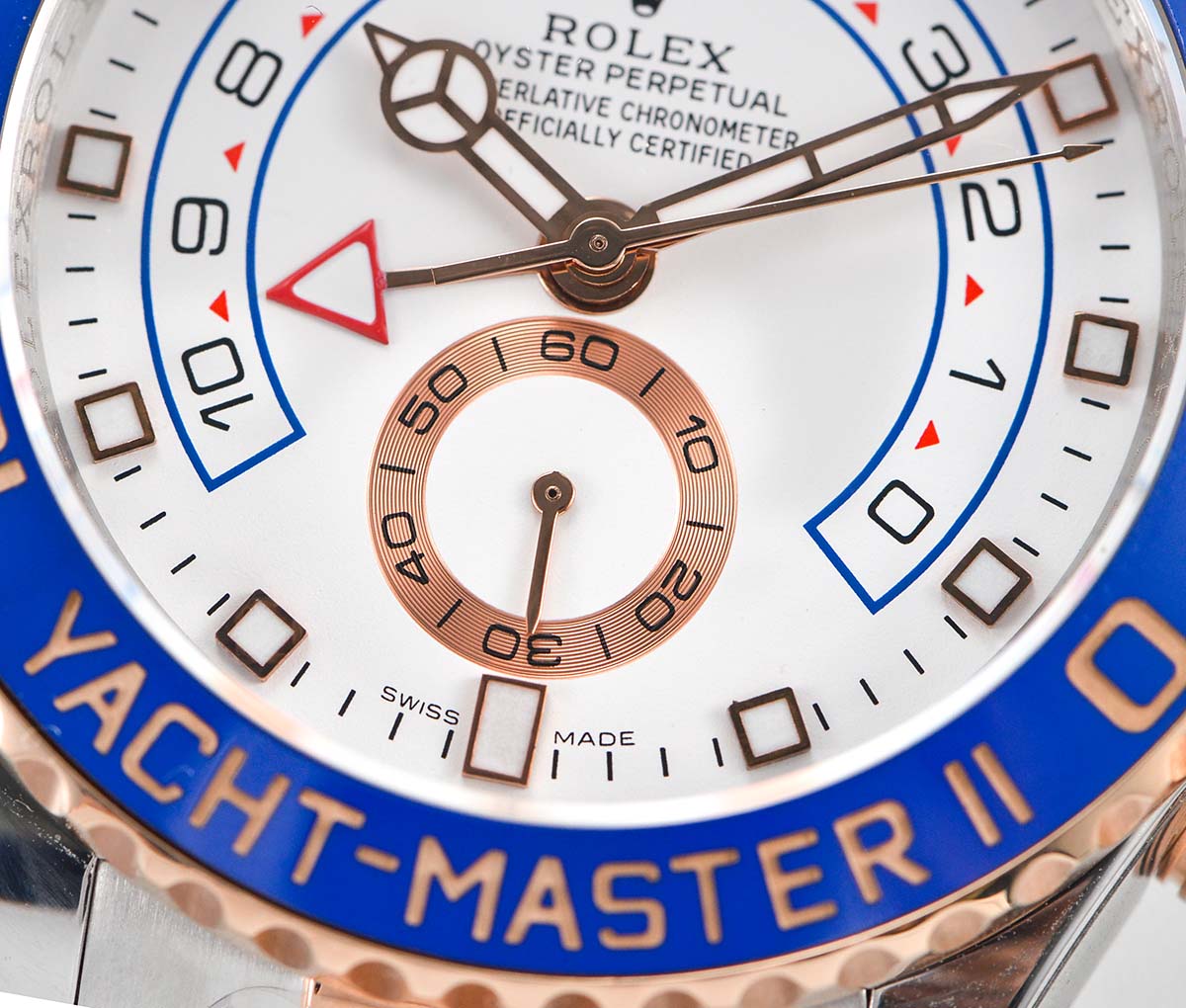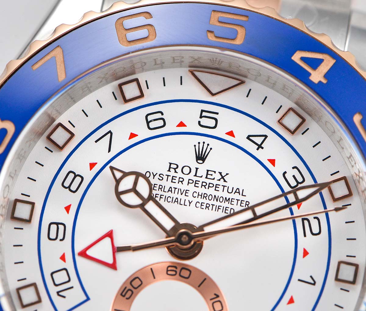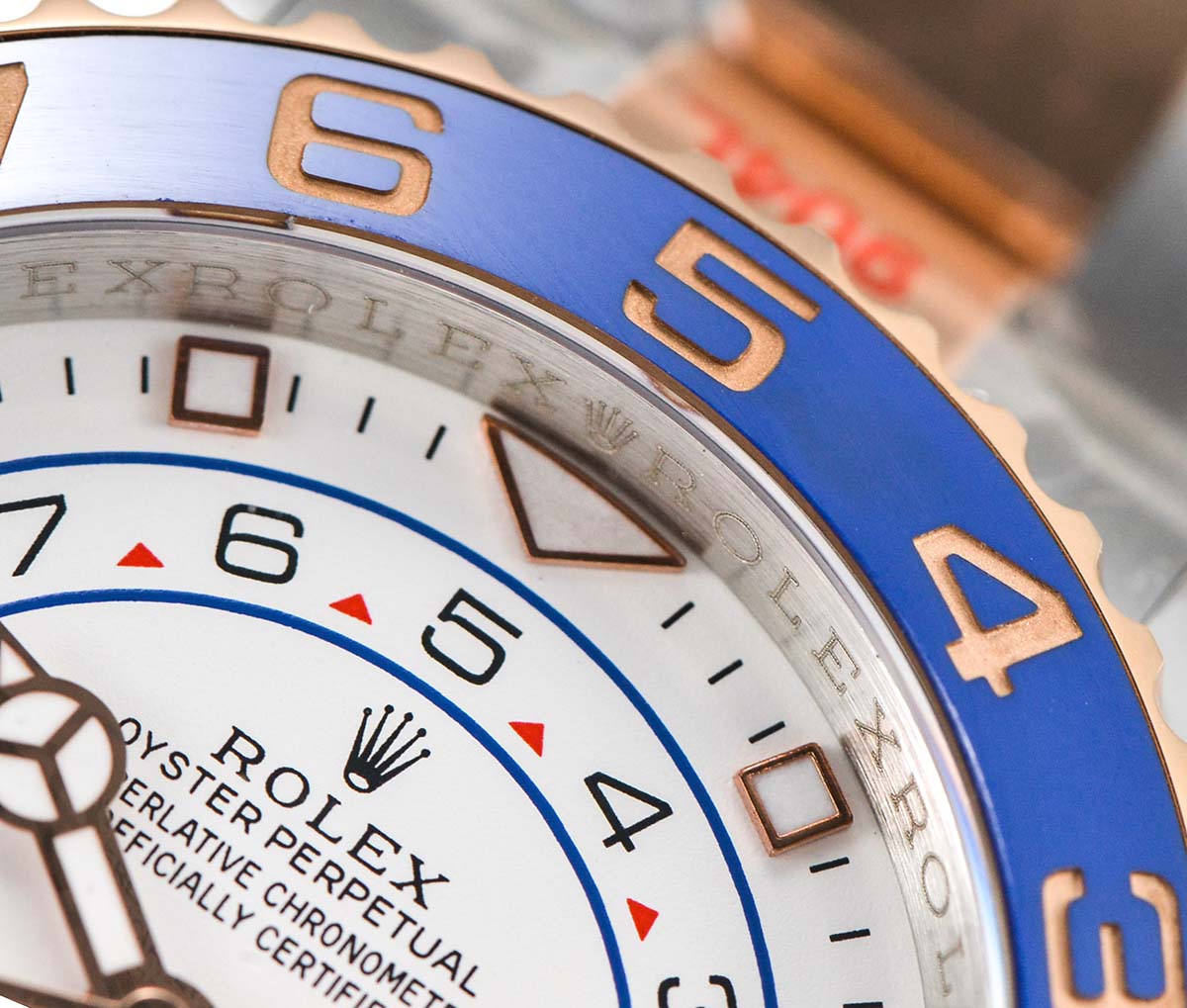 | Bezel | 18K rose gold plated rotating blue ceramic bezel with depth gold bezel markers |